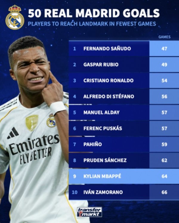 👑皇马队史50运动活动 场 次排行榜:姆巴佩第9,C罗第3迪斯蒂法诺第4