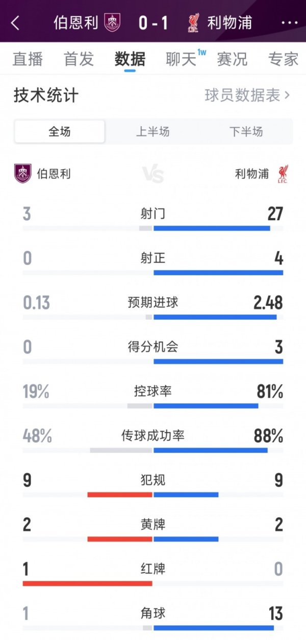 利物浦1-0伯恩利全场数据:射球 27-3,射正4-0,红军盘带时间 超8成