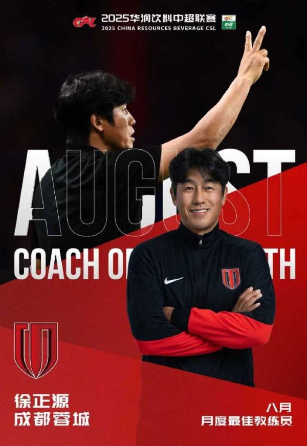 率领蓉城3胜1平!官方:徐正源当选中超8月最佳指导教练员