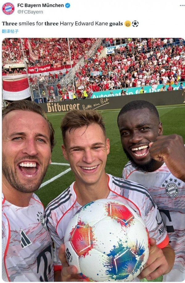 上演独中三元,拜仁官推晒凯恩与队友以及赛事 用球的合影