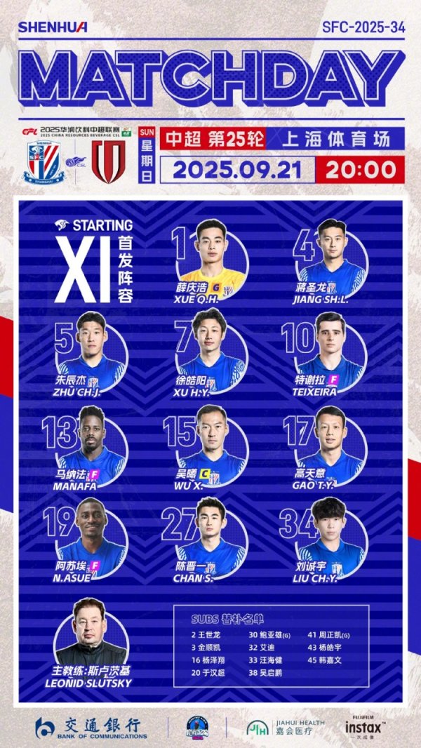 中超职业联赛 第25轮上海申花vs成都蓉城杆位名单
