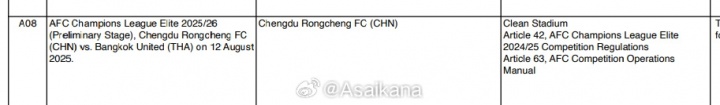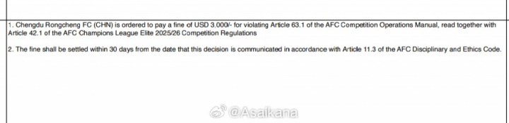 亚足联纪律委员会对成都蓉城处以罚款3000美元的罚款