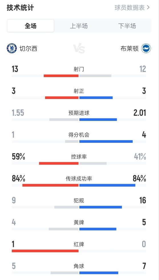 切尔西1-3布莱顿全场数据:射球 13-12,射正3-3,盘带时间 59%-41%