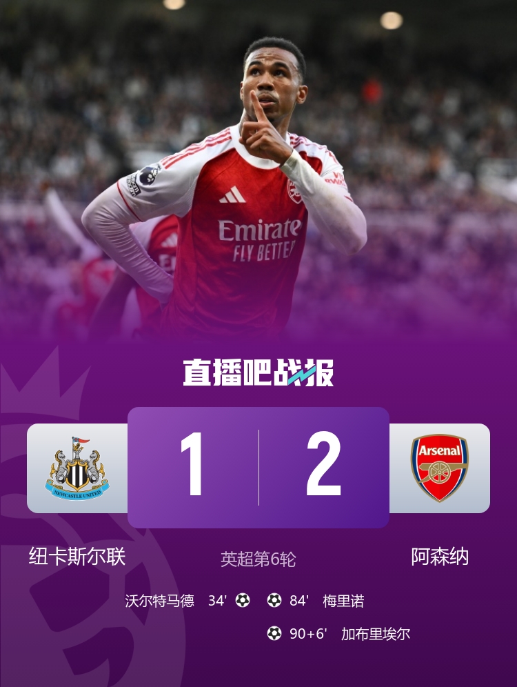 梅里诺顶球扳平比分,补时阶段加布里埃尔致胜球 !最终,阿森纳2-1反转 纽卡,距离榜首2分。