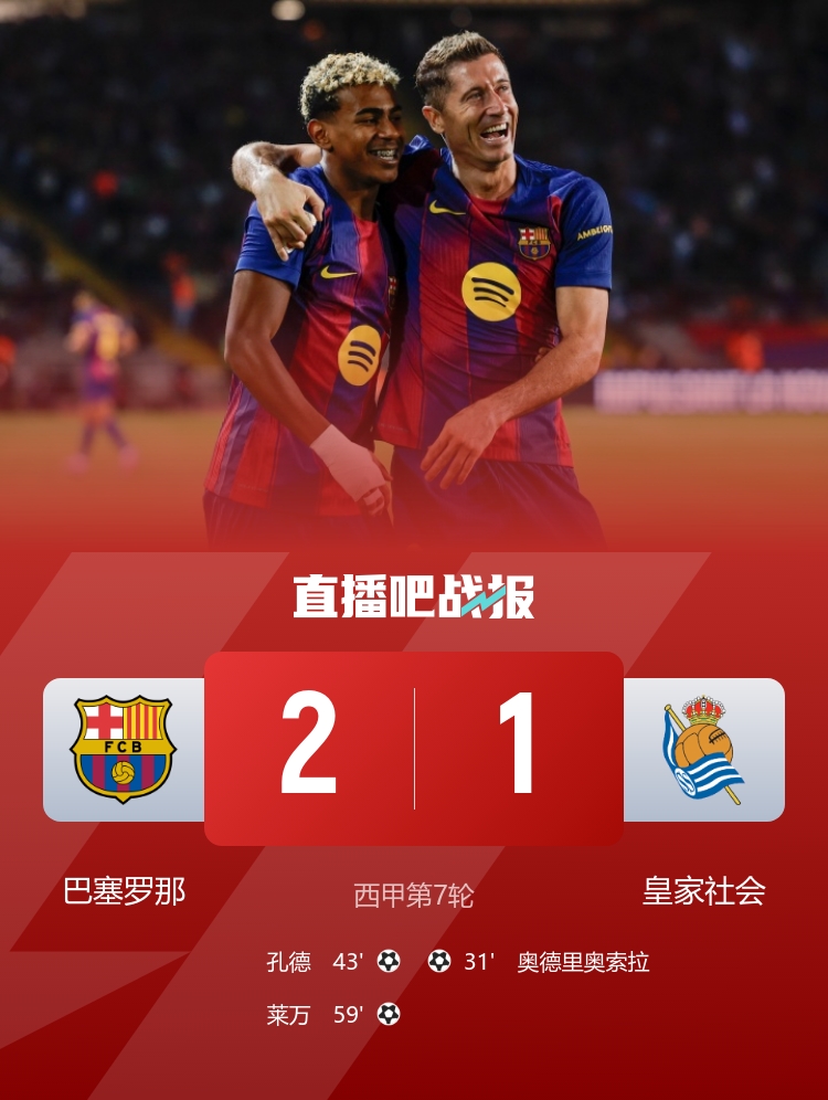孔德扳平,亚马尔助功 莱万破门,最终巴萨2-1反转 皇家社会,1分优势领跑积分榜。