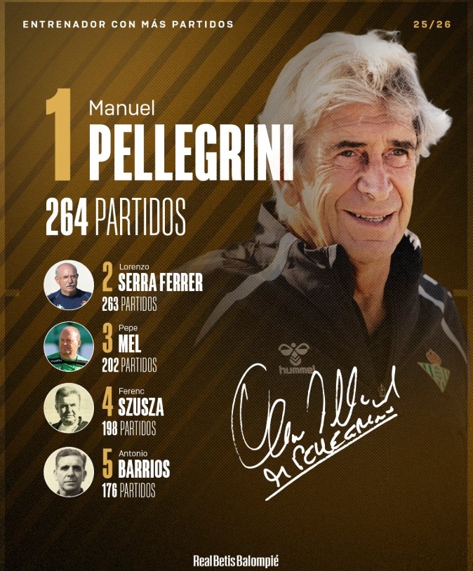 佩莱格里尼迎来自己执教贝蒂斯的第264场赛事 英超联赛 曼城客场小胜埃弗顿,这让他跨越 洛伦佐-塞拉-费雷尔成贝蒂斯队史执教场次最多的主指导教练员。