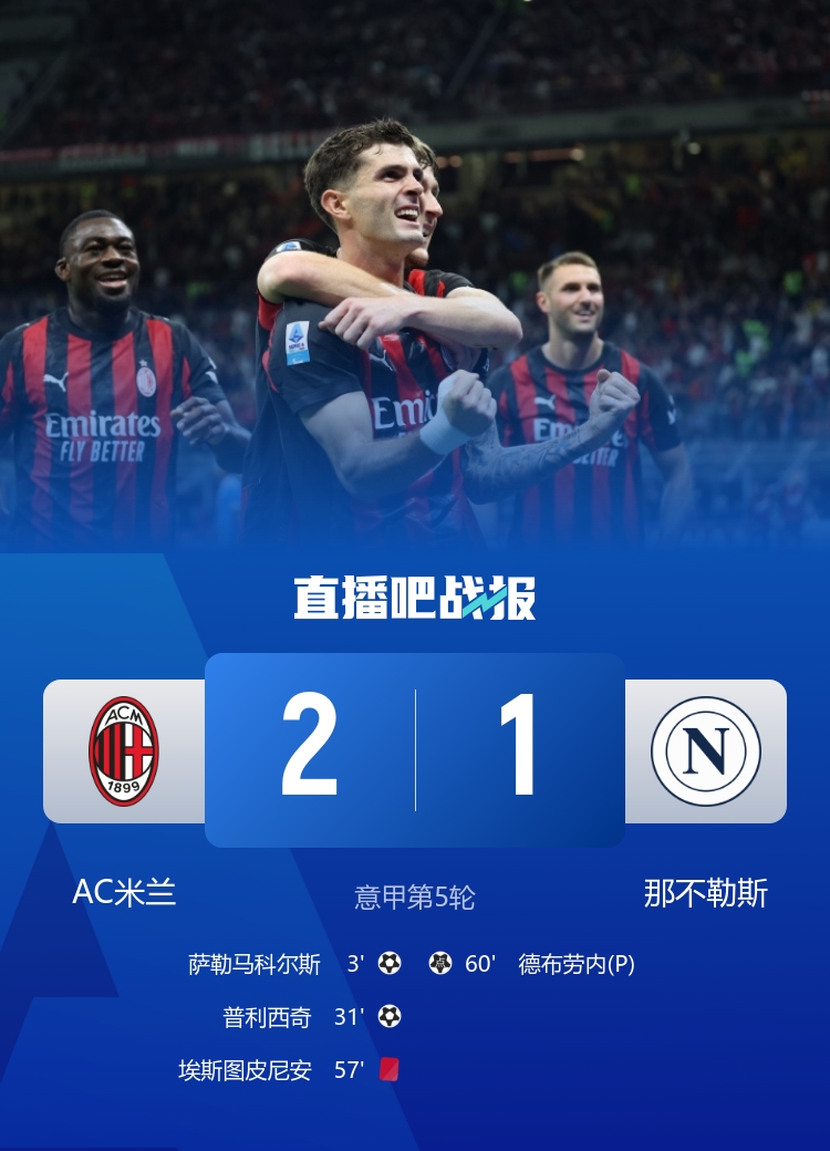 普利西奇传射,埃斯图皮尼安吃到红点套餐,德布劳内点射扳回一球!最终,AC米兰2-1击败那不勒斯,登顶意甲积分榜!