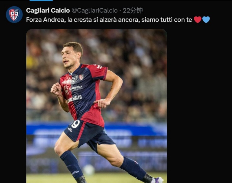 卡利亚里官方消息,前场球员贝罗蒂遭遇十字韧带撕裂。