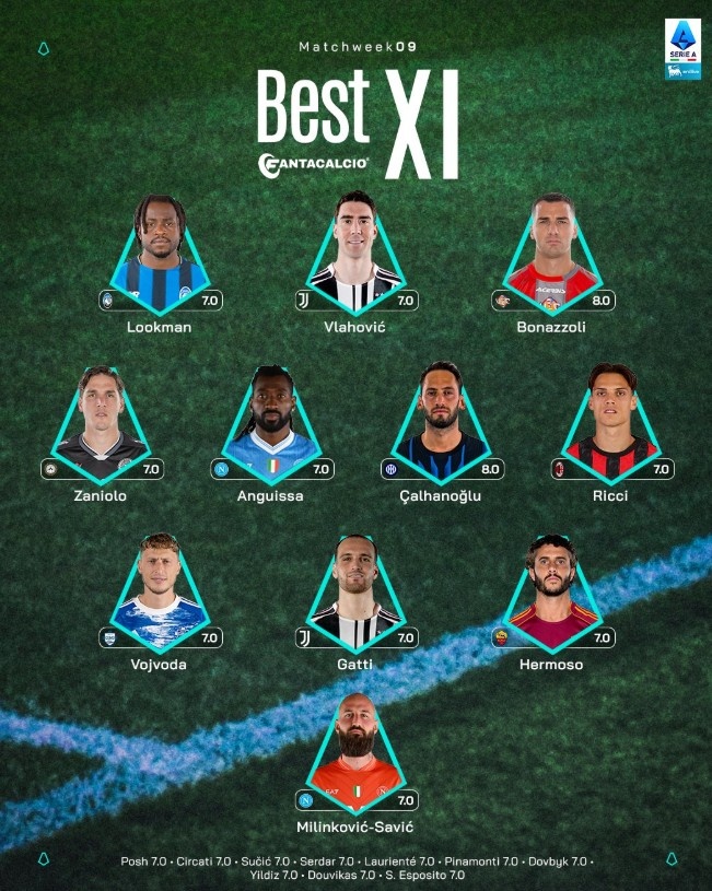 意甲第9轮最佳阵:DV9、恰20入选,加蒂、扎尼奥洛、里奇在列