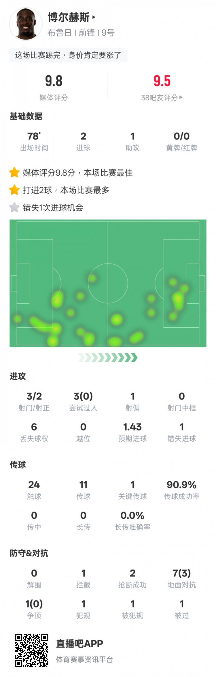 2球1助!博尔赫斯当选布鲁日3-3巴萨一役全场最佳球员
