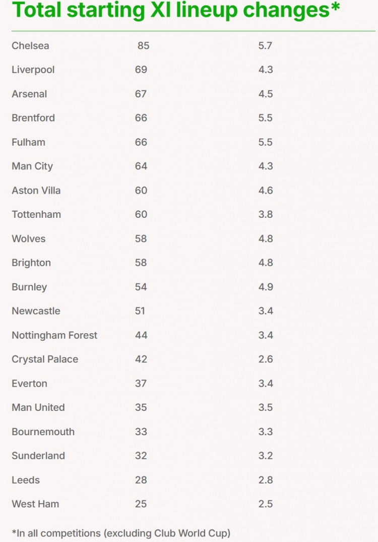 本赛季英超各队杆位阵形 调整次数:切尔西85次居首,红军枪手二三