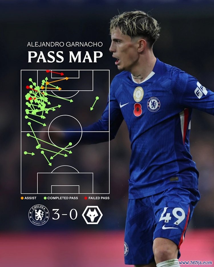 11月10日讯 切尔西在本轮职业联赛 3-0完胜狼队,加纳乔表现抢眼送出2次助功 。