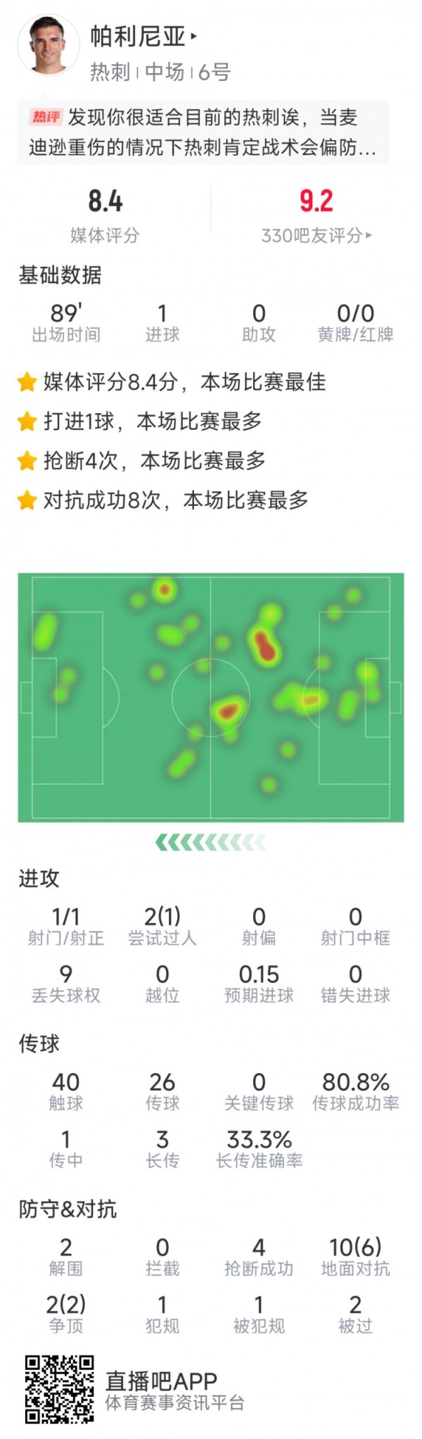 帕利尼亚本场数据:1粒得分 ,4抄截 ,8次成功对峙 ,评分全场最高