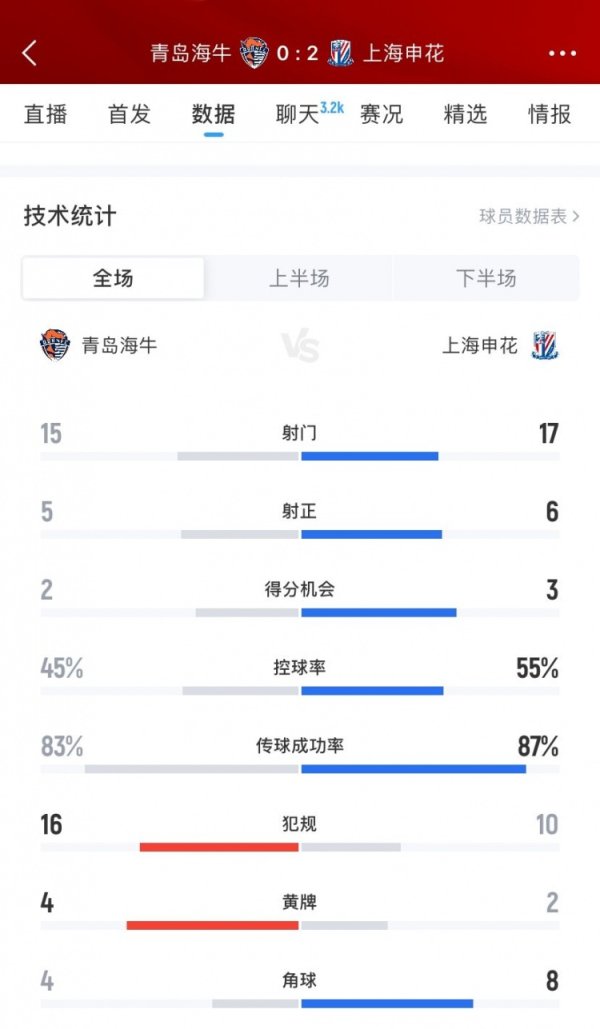 上海申花2-0青岛海牛数据:射球 17-15、射正6-5、盘带时间 55%-45%