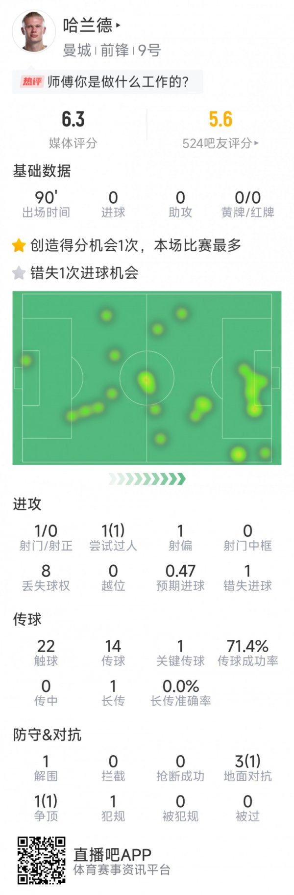 机会寥寥,哈兰德本场数据:1射球 0射正,1次错失良机,评分6.3分