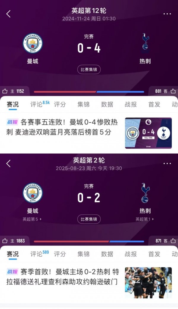 英超联赛官网app 08月23日讯 曼城主场作战 0-2不敌热刺英超联赛官网app,热刺开赛2连胜暂登顶。热刺连续2场做客伊蒂哈德主场作战 取得获胜 ,连续2场零封轰6球。......查看更多