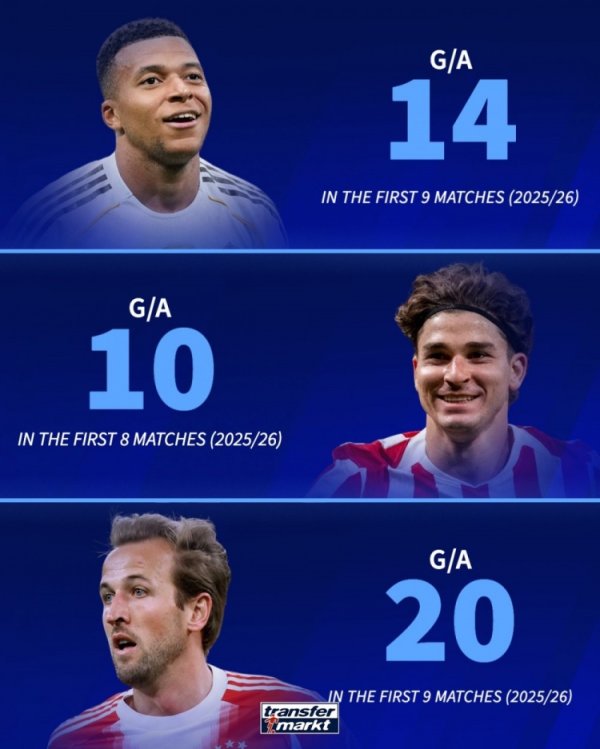 德转列数据:凯恩新赛季9场造20球,姆巴佩9场14球小蜘蛛8场10球