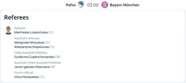 拜仁客战帕福斯裁判 组名单:立陶宛主裁执法,西班牙人VAR裁判 组