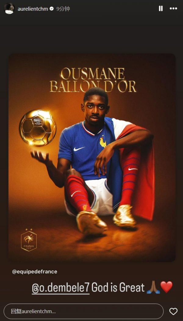 登贝莱夺得金球,琼阿梅尼转发海报祝贺:上帝伟大🙏❤️