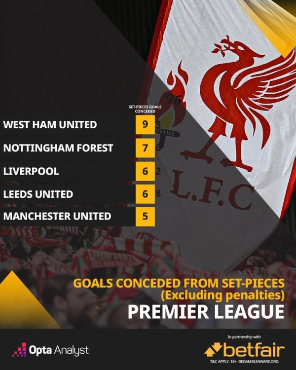 大难题!本赛季,英超中仅森林和西汉姆联比利物浦任意球丢球更多