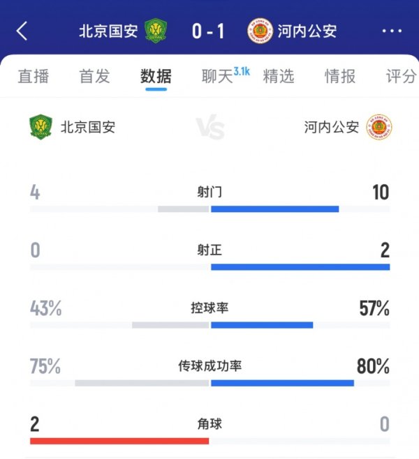 半场数据:国安主场作战 0射正遭河内压制!盘带时间 落下风,对手10射球