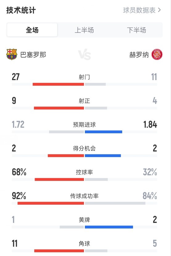 巴萨2-1赫罗纳全场数据:射球 27-11,射正9-4,盘带时间 68%-32%