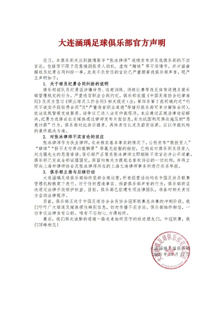 10月17日下午,大连涵瑀古代足球 俱乐部发布官方声明: