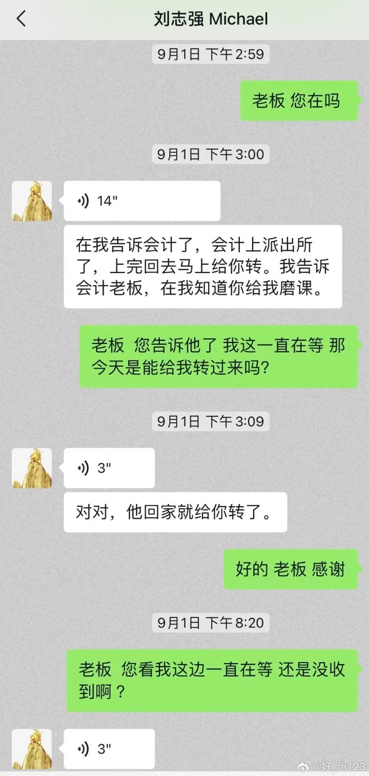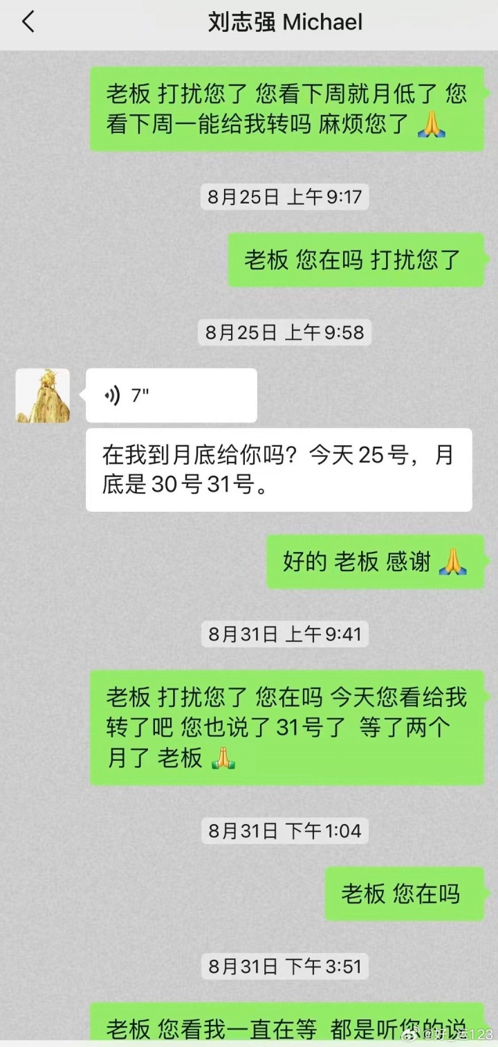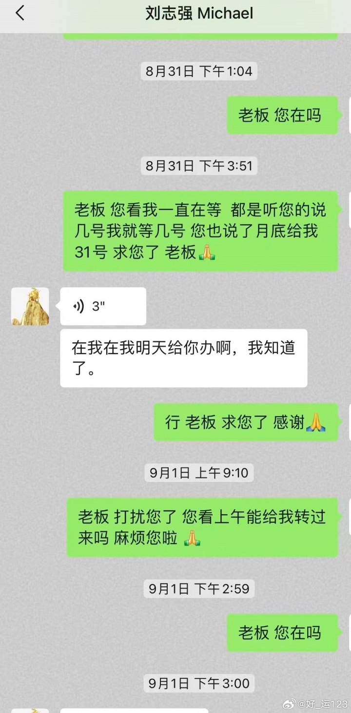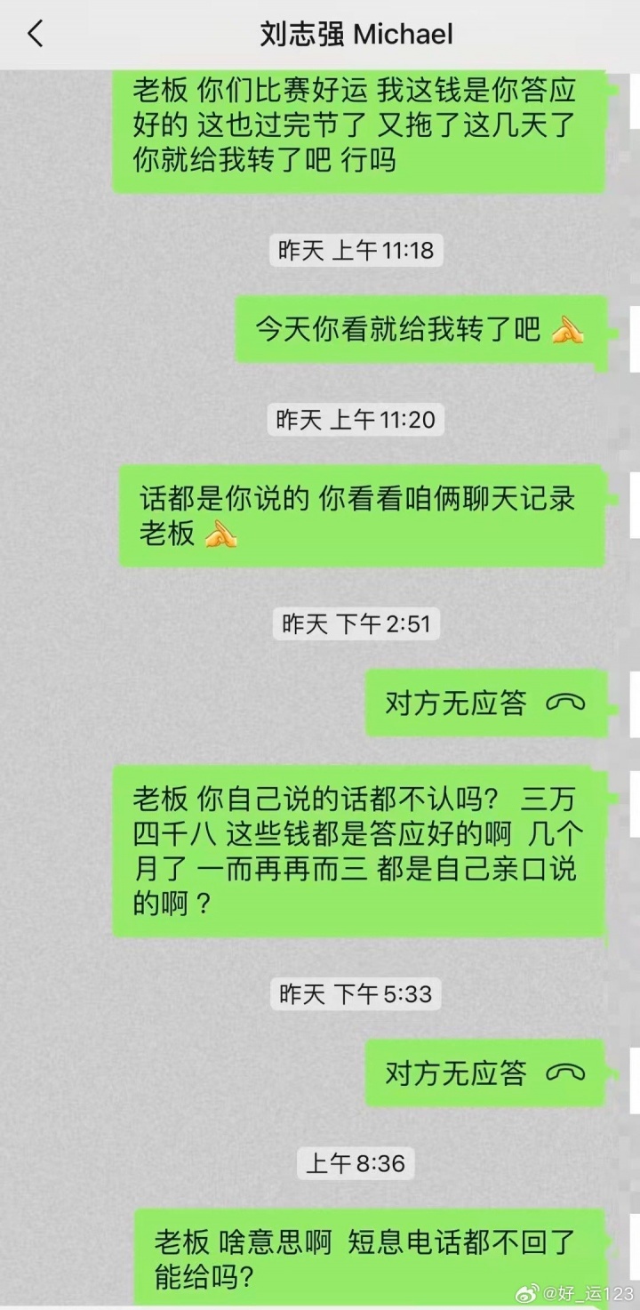 纪勇发文:“❗️❗️大连涵瑜古代足球 俱乐部老板刘志强!微信不回电话不接 拖欠球员工资34800元!从八月份至今一分钱没有给!期间多次要钱 总是以各种理由推脱!恳求各方主持公道!”