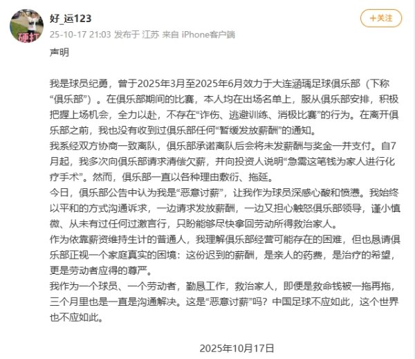 球员纪勇:讨薪为家人进行化疗手术,被大连涵瑀称“恶意讨薪”