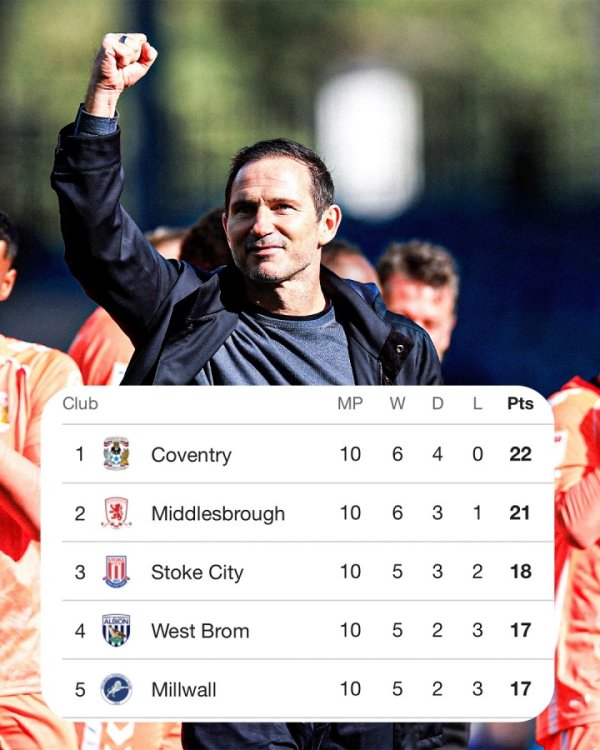高歌猛进!兰帕德率队4连胜0丢球轰14球,考文垂10轮不败领跑英冠